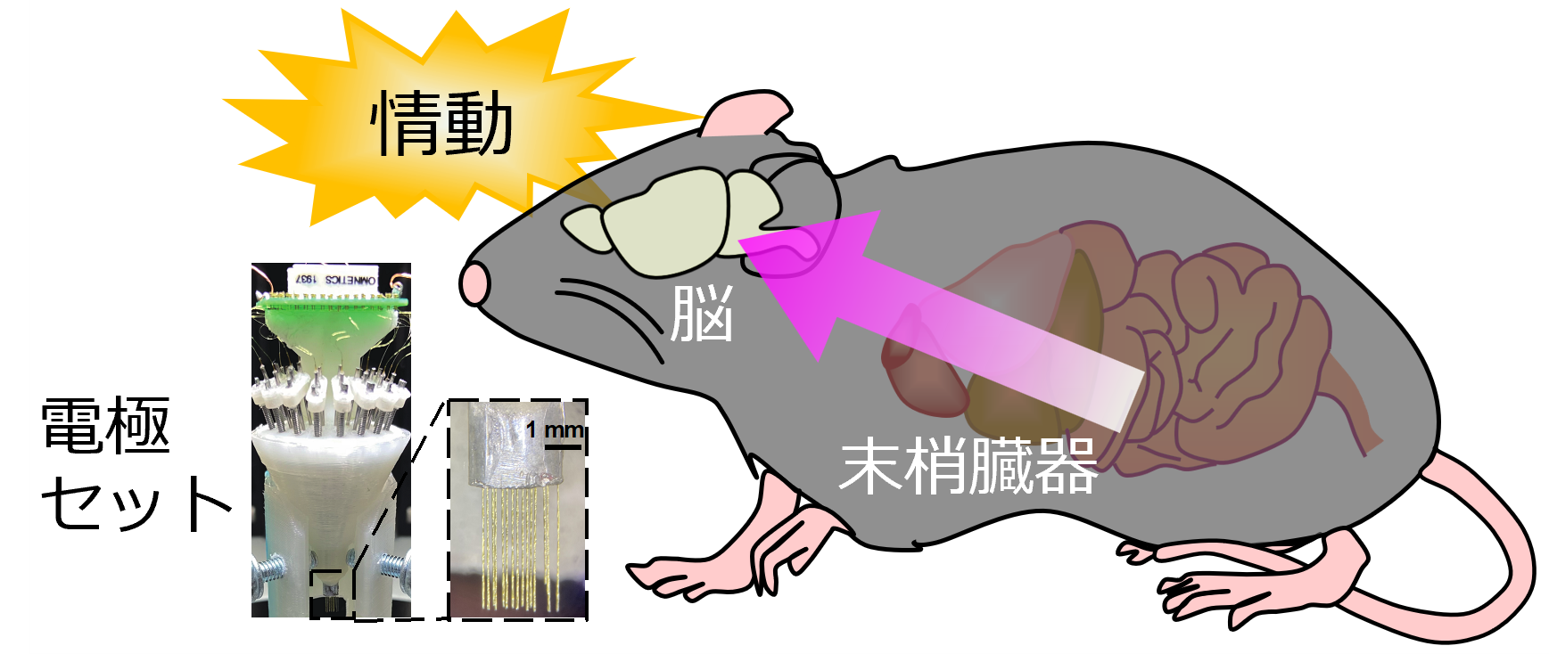 私たち動物は、外界の刺激に反応して快・不快やモチベーションなどの「情動」を生じます。情動は単なる感情的な反応ではなく、「怖い → 逃げる」といったように、その後の意思決定や行動選択につながる、生存や社会適応に不可欠なシステムです。こうした情動は脳によって決定されると考えられていますが、近年、心拍数や腸内環境の変化など、末梢臓器の内部状態も情動に影響を与えることが明らかになりつつあります。これらの知見は、情動を理解するうえで、脳だけでなく末梢臓器にも注目する必要があることを示唆しています。このような脳-末梢連関の視点は、19世紀の心理学研究において「情動の末梢起源説」としてすでに提唱されていました。しかし、この仮説はいまだ主流とは言えず、末梢臓器からの情報がどのように脳へ伝達・処理され、情動へと至るのか、その詳細なメカニズムは解明されていません。この課題に取り組むためには、脳・末梢臓器・情動を包括的に調べる必要があります。